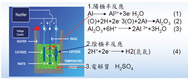 阳极的铝层在电解溶液中通直流后增厚,以铝作为阳极(正极)。 电流在阴极(负极)释放氢气在铝阳极表面氧化生成氧化铝。不同溶液要求的电压可能从1 到300 V (直流). 虽然大部分电压在15-21V,但是通常在硫酸和有机酸中需要相对高的电流来形成更厚的涂层。阳极氧化的电流在铝被氧化区域不一样,通常为30?300安培/平米(2.8至28安培/平方英尺)。